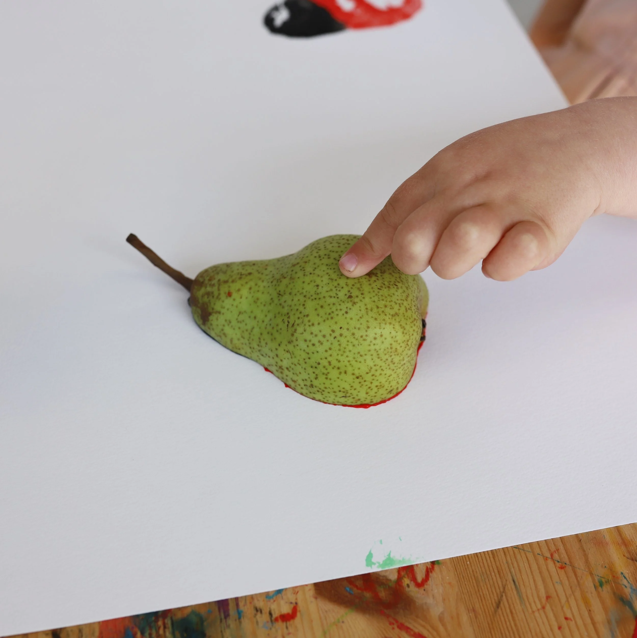 For the lady bug: Paint the top section of the pear black, & the bottom section red. Ensure you have applied plenty of paint as the fruit tends to absorb it!