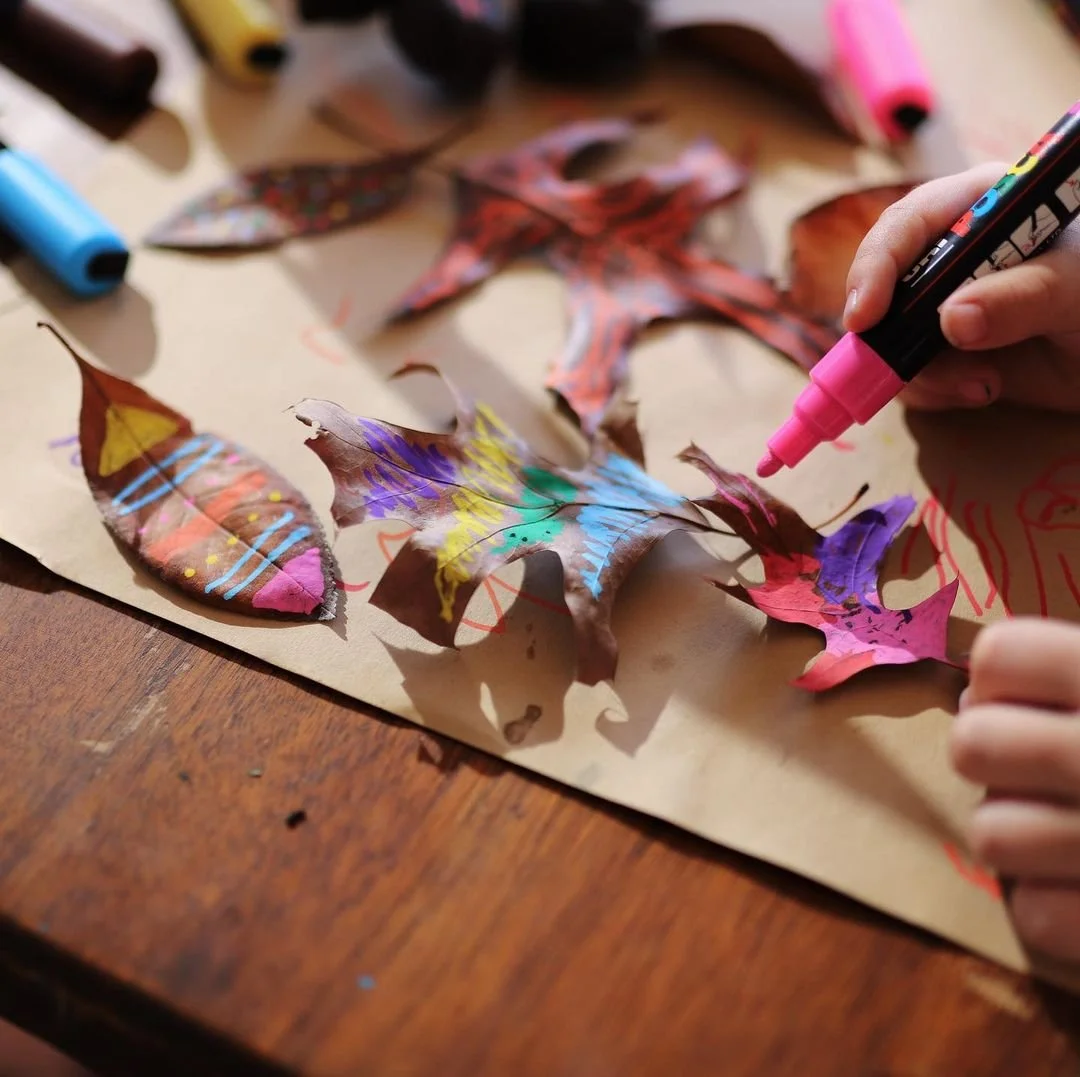 As simple as it sounds. Collect a bunch of Autumn leaves (flat & dry are best) & get scribbling! We used our Posca pens which produce the most vibrant colours on a variety of surfaces. Colour them in, create patterns or funny faces. Easy peasy fun!